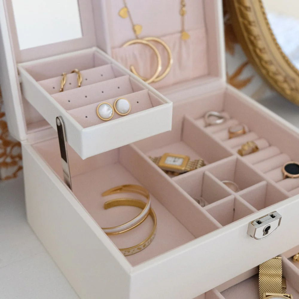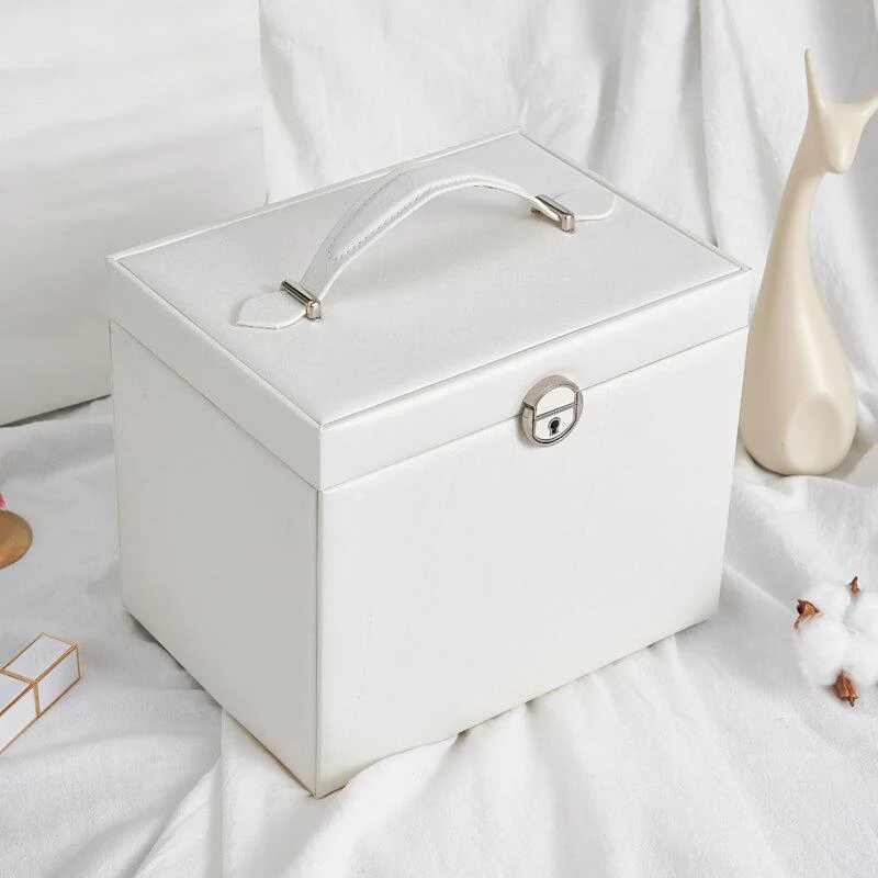 Tato bílá šperkovnice je mnohem víc než jen obal. Její elegantní design a harmonické linie symbolizují ženskost a eleganci. Díky integraci s různými doplňky se skvěle hodí pro každou příležitost, ať už jde o výjimečný večer nebo běžný den. Dopřejte si rafinovanost a eleganci s naší bílou šperkovnicí. Šperkovnice, kterou musí mít všichni milovníci šperků, v sobě spojuje praktičnost, bezpečnost a eleganci. Uchovávejte své drahocenné předměty v bezpečí, elegantně a diskrétně.